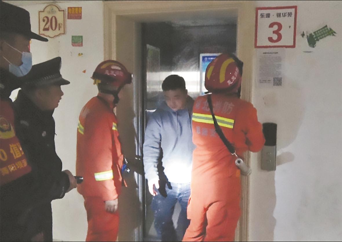 “時間緊迫,咱們就一層層搜,每個電梯口喊話詢問。”現場指揮員立即制定救援方案。隨后,消防員和民警逐層爬樓,搜尋被困人員,并由兩名經驗豐富的消防員利用電梯鑰匙、撬棍、手電筒等工具進行救援。