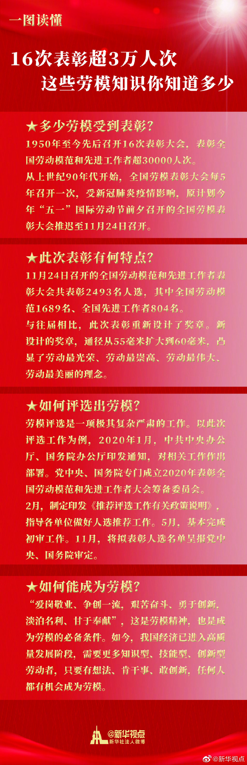 24日,1689名全國勞動模范和804名全國先進工作者在人民大會堂受到表彰,代表全體勞動者接受黨和國家的最高禮贊。新中國成立以來表彰了多少勞模?勞模是怎樣評選出來的?如何才能成為勞模?戳圖了解↓