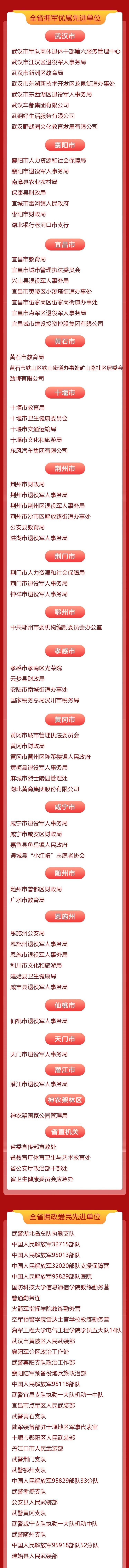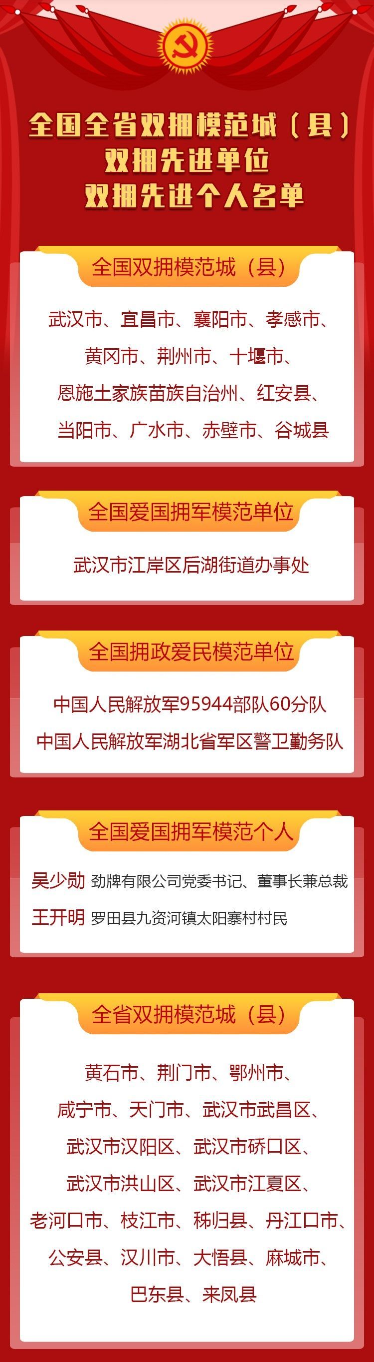 會上,授予黃石市等20個地區(qū)全省“雙擁模范城(縣)”榮譽(yù)稱號,授予武漢市軍隊離休退休干部第六服務(wù)管理中心等70個單位“擁軍優(yōu)屬先進(jìn)單位”、武漢市委組織部干部一處副處長劉棟等70名同志“擁軍優(yōu)屬先進(jìn)個人”、武警湖北省總隊執(zhí)勤支隊等30個單位“擁政愛民先進(jìn)單位”、武漢警備區(qū)政治工作處干事王文冬等30名同志“擁政愛民先進(jìn)個人”榮譽(yù)稱號(名單附后)。
