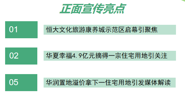 該階段,消費日報網、中國網等央媒,以及楚天都市報、荊楚網等省級媒體積極關注聚焦恒大地產、華夏幸福、華潤置地、碧桂園等相關動態,內容主要涉及地塊競拍動態、房產市場及行業發展趨勢等層面,熱度較高的報道有“首破3萬元!武漢樓面地價創新高”“南國置業擬6.45億元轉讓湖北森南房地產100%股權 ”“房企年末拿地熱情降溫 ”。