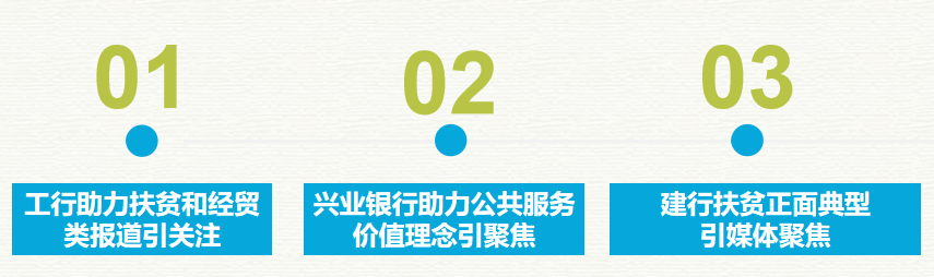 該階段,新華社、中國新聞網(wǎng)、人民網(wǎng)、央廣網(wǎng)、中國網(wǎng)、消費日報網(wǎng)等央媒,以及湖北日報、楚天都市報、荊楚網(wǎng)等省級媒體積極關(guān)注聚焦工商銀行、興業(yè)銀行、建設(shè)銀行等相關(guān)動態(tài),內(nèi)容主要涉及扶貧案例及典型、助力公共服務(wù)和地方經(jīng)濟發(fā)展等層面。