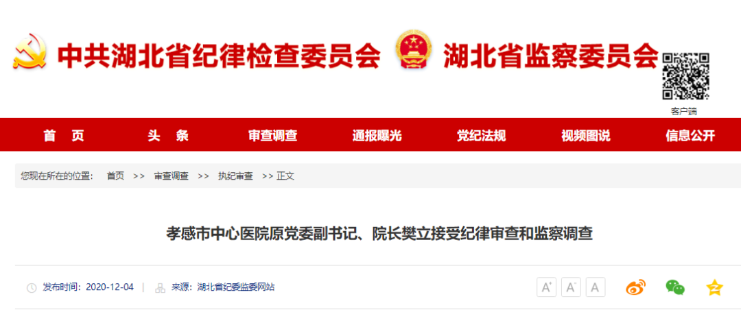 孝感市中心醫(yī)院原黨委副書記、院長樊立接受紀律審查和監(jiān)察調(diào)查