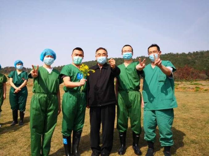 江夏方艙醫院休艙當天,父親張伯禮院士(右三)在江夏方艙醫院外合影。通訊員張碩 攝