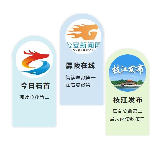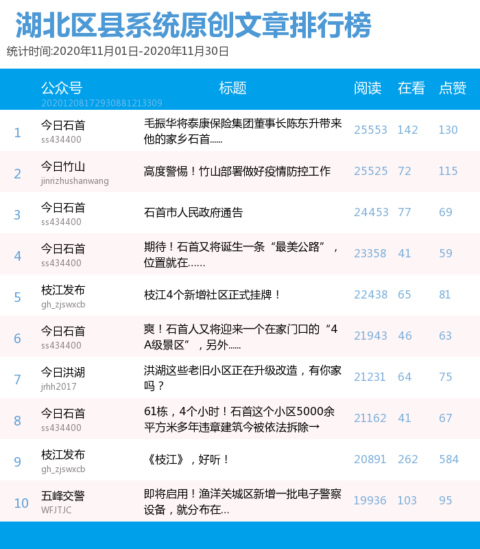 11月,“孱陵在線”“今日石首”繼續占據前兩名,在閱讀總數上依然領先。第三名“枝江發布”的在看總數和最大閱讀數也較為可觀。