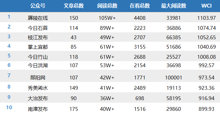 本期上榜公眾號的最大閱讀數較上月相對持平,“鄖陽網”“枝江發布”“大冶發布”“掌上宜都”等均有最大閱讀數超過5萬的文章。