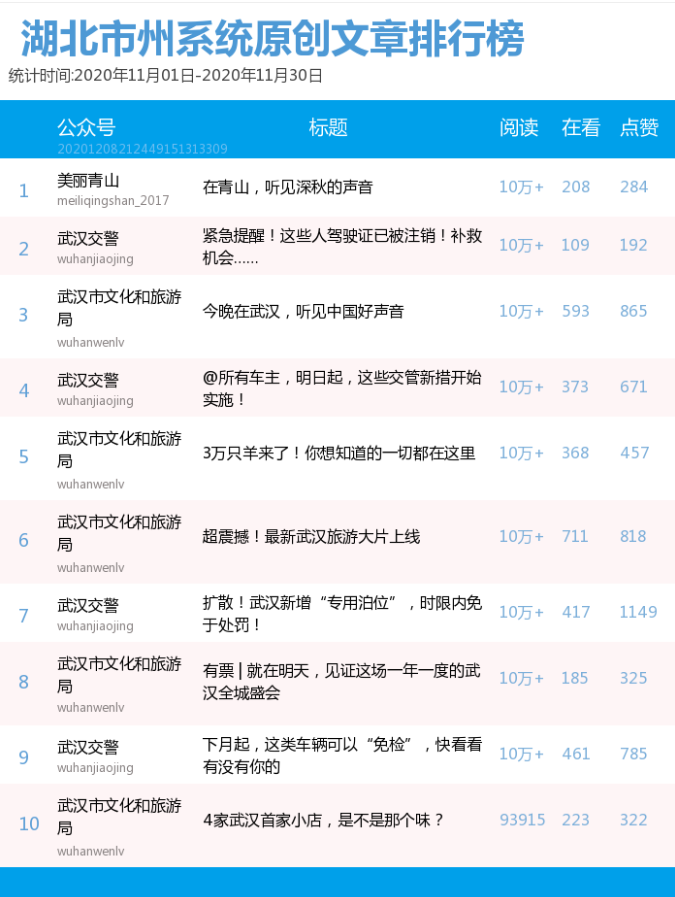 本期原創(chuàng)文章排行榜幾乎被10萬+文章霸榜,且文章主要來自“武漢市文化和旅游局”“美麗青山”和“武漢交警”。從文章題材來看,“美麗青山”和“武漢交警”依舊在自己擅長的領域深耕,持續(xù)發(fā)揮優(yōu)勢,相關文章《在青山,聽見深秋的聲音》《緊急提醒!這些人駕駛證已被注銷!補救機會……》《@所有車主,明日起,這些交管新措開始實施!》不但收獲10萬+閱讀量,也收獲較高的在看數和點贊量。