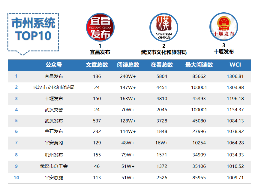 12月10日,由荊楚網(湖北日報網)、楚天輿情數據研究院制作的湖北市州微信排行榜11月榜單發(fā)布,“宜昌發(fā)布”由上期第三上升至本期第一名;“武漢市文化和旅游局”從上期第一變?yōu)楸酒诘诙?;“十堰發(fā)布”從上期第四上升為本期第三名,成為本期黑馬,打破了前三甲多期蟬聯(lián)的局面。