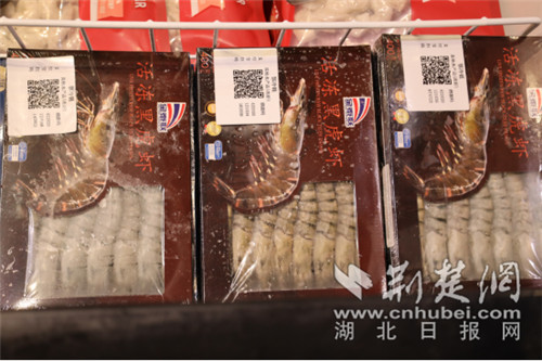 貼上“鄂冷鏈”追溯碼的泰國活凍黑虎蝦。記者張茜攝