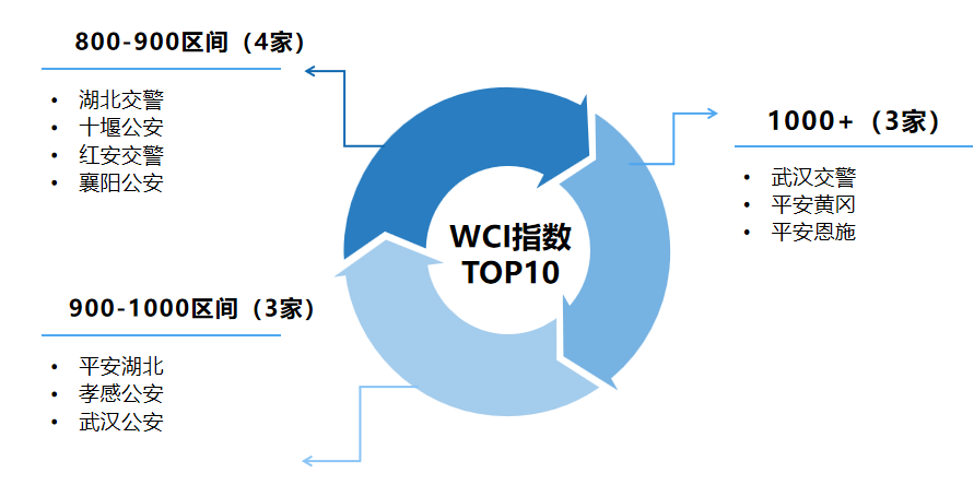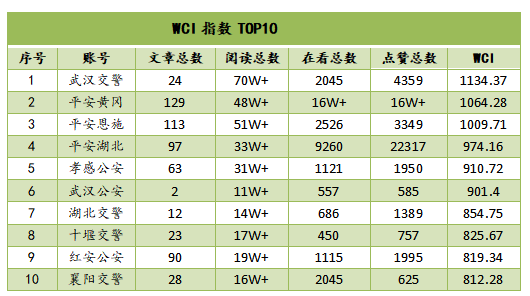 本期湖北公安行業榜單前十微信號在看總數、點贊總數、閱讀總數和WCI指數持續上升。從WCI指數來看,本月有3家單位WCI指數突破1000,分別是“武漢交警”“平安黃岡”和“平安恩施”;WCI指數900-1000的單位有3家,分別是“平安湖北”“孝感公安”和“武漢公安”;WCI指數800-900區間有4家,分別是“湖北交警”“十堰公安”“紅安交警”和“襄陽公安”。排行榜尾部公眾號后期還需在內容選題和文章結構上下功夫,有較大的提升空間。