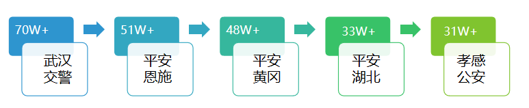 本期閱讀總數Top5與上期排名保持一致,“武漢交警”憑借24篇推文收獲70W+閱讀量,其中5篇10W+網站,奪得該項指數第一。“平安恩施”共發布113篇文章收獲51W+閱讀量,閱讀總數較上期大幅上升;“平安黃岡”發文129篇,共收獲48W+閱讀量,16W+點贊數和在看數;排名第四的“平安湖北”發文99篇,收獲33W+閱讀數;排名第五的“孝感公安”比“平安湖北”少發36篇文章,但閱讀總數較“平安湖北”僅少2W+,具有較大上升潛力。