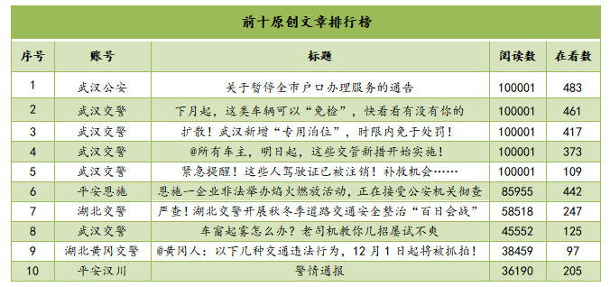 總體來看,11月份湖北公安行業上榜原創文章中有8篇屬于“交警”系微信號。原創文章前十榜單中,“武漢交警”占據5席,且閱讀數均突破10W+,表現強勢;“武漢公安”“平安恩施”“湖北交警”“湖北黃岡交警”“平安漢川”各攜1篇文章上榜,后期進步空間較大。