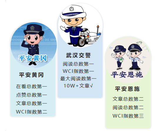 “武漢交警”“平安黃岡”“平安恩施”榮登榜單前三甲。其中“武漢交警”包攬閱讀總數、最大閱讀數、WCI指數等多項指數的第一名,且有4篇原創10W+文章誕生。“平安黃岡”穩步上升,奪得本期榜單亞軍,且包攬在看總數、點贊總數、文章總數等單項指數排名第一名,綜合實力不容小覷。“平安恩施”各項指數也處在高位平均水平,奪得榜單季軍。
