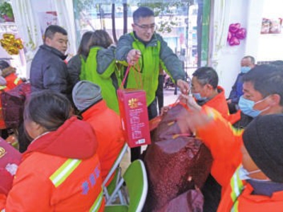 孝感晚報訊(記者韓和平 通訊員李家繼 攝)12月17日孝感養乃世家公司在長征二路舉辦為環衛工人送溫暖的公益愛心活動,30位環衛工人收到了一床暖心羊毛被和愛心食品。