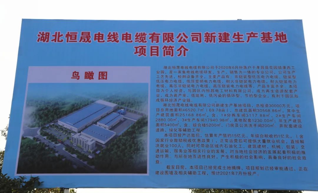公司新建生產基地項目總投資3億元。于2020年6月份落戶于孝昌縣花園鎮澴西工業園,是一家集電線電纜研發、生產、銷售為一體的專業公司,本項目投產達效后,年產值約15億元,年綜合稅收約1億元。