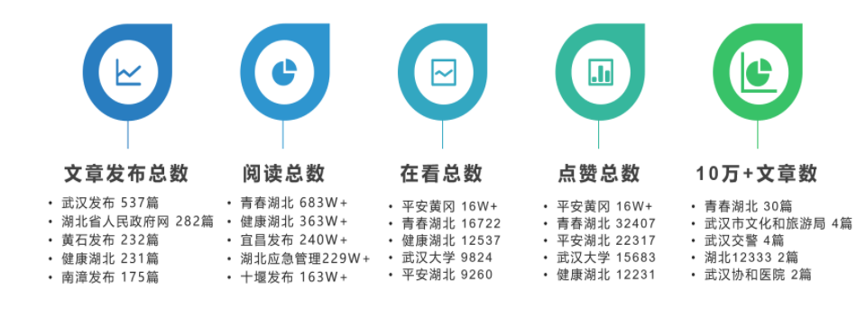 從文章發布總數來看,整體較上月有小幅度上升,其中“武漢發布”以537篇位居第一;從閱讀總數來看,本期前兩名排名不變,“宜昌發布”以240萬+超過“湖北應急管理”,排名第三,“十堰發布”躋進前五;從在看總數來看,本期排名與上期保持一致,其中“平安黃岡”以16萬+次斷層式位列第一;從點贊總數來看,整體有小幅度上升,“平安黃岡”同樣以16萬+次獲得冠軍,“青春湖北”緊隨其后,“平安湖北”以22317次打敗“武漢大學”和“健康湖北”,排名第三。本期僅有“青春湖北”閱讀數超過10萬+的文章達到兩位數,為30篇,其余進入前五的微信號10萬+文章數在2~4篇之間。