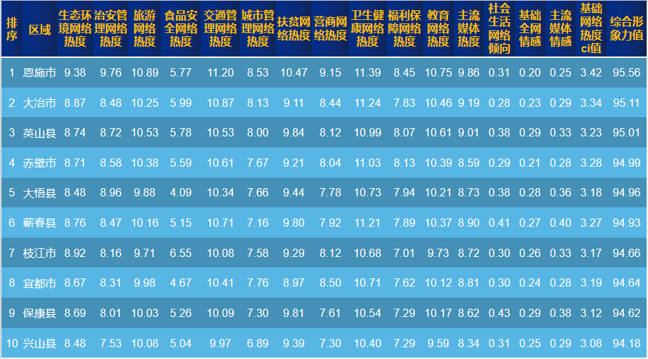 2020年我省各區縣正面宣傳亮點突出。2020年度湖北城市傳播力十佳區縣分別為恩施市、大冶市、英山縣、赤壁市、大悟縣、蘄春縣、枝江市、宜都市、保康縣、興山縣。