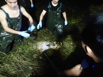 11月20日傍晚,在姜某心的指認下,專案組副組長黃河組織20余名民警下到水塘,徒手搜尋,順利起獲作案鐵錘。