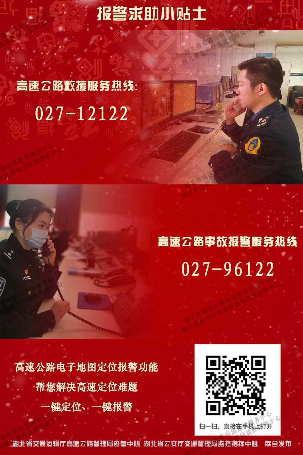 如果車輛在湖北省高速公路發生故障需要救援,請撥打統一救援電話027-12122;如果發生交通事故,請撥打統一事故報警電話027-96122;還可以通過在百度地圖或百度APP程序內,語音呼叫小度,輸入語音“我要報警”;或直接掃描上圖二維碼,即可智能展示報警人位置,將報警人位置信息提供給接警員,讓民警更快找到報警人。