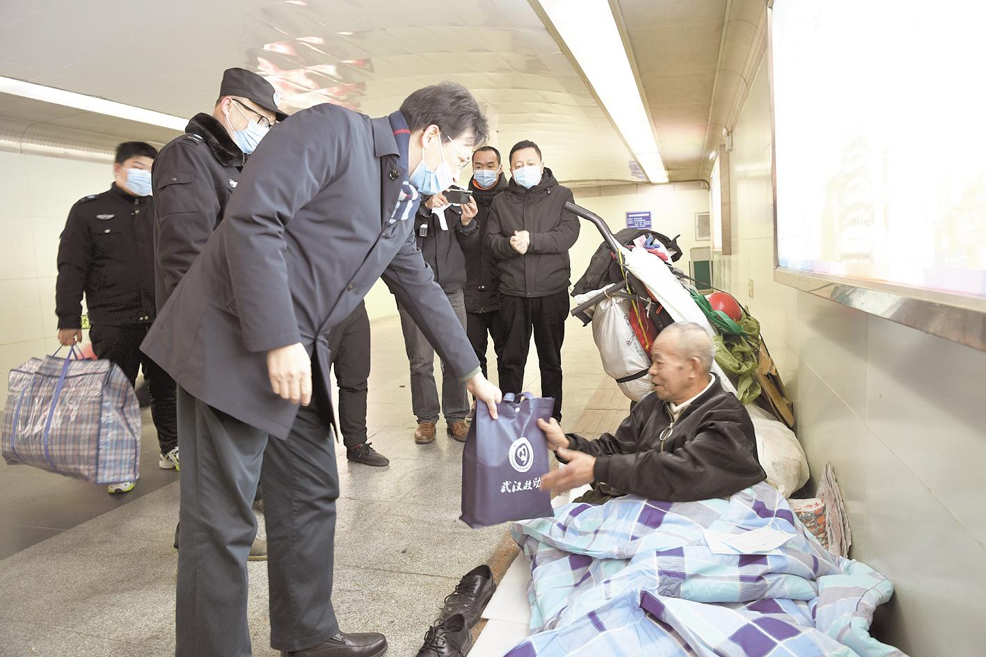 武漢市民政局與武漢市救助管理站聯合上街救助困境群眾。 (武漢市救助管理站供圖)