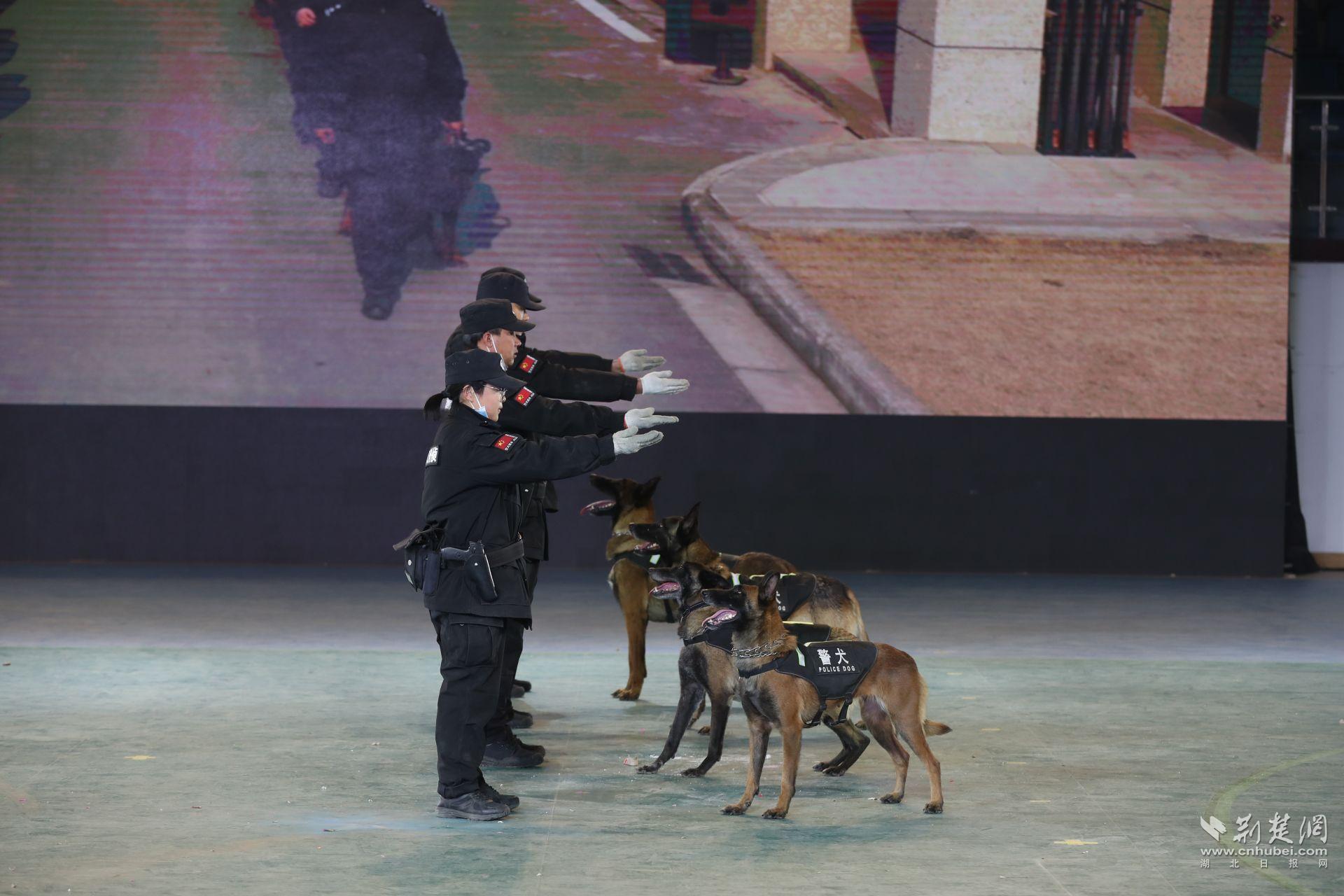 緊張刺激過(guò)后,搜爆、搜毒、搜血犬逐一登場(chǎng),小家伙們盡管受到聲、光、影等多種干擾,仍按指令出色完成任務(wù)。大屏幕上短片介紹,“近年來(lái),武漢公安警犬基地參與大型活動(dòng)安保、重大案件偵查270余起,在各類安保、物證搜集追蹤上發(fā)揮了無(wú)可替代的關(guān)鍵性作用。”
