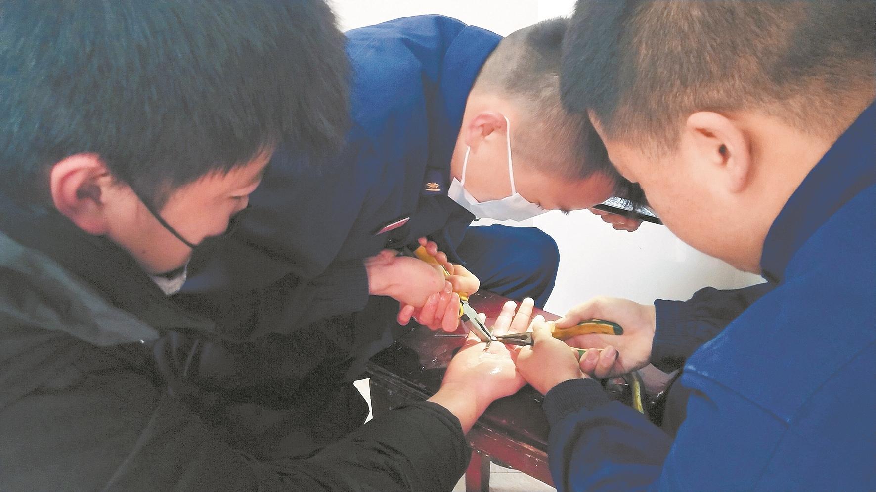 何金華先使用電動砂輪機,對鋼制戒指表面進行切割,然后再用老虎鉗配合剪切。10分鐘后鋼戒指被順利取下。經觀察,該男生的手指并無大礙,消防員叮囑其趕緊去醫院做消毒處理。