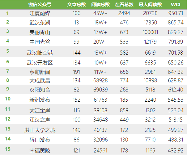 2021年1月12日,由荊楚網(湖北日報網)、楚天輿情數據研究院制作的武漢城區政務微信2020年11月排行榜發布。本期榜單,“江夏融媒”繼續蟬聯榜首;“武漢東湖”與“美麗青山”與上期相比位置互換,分別列居第二、三位。