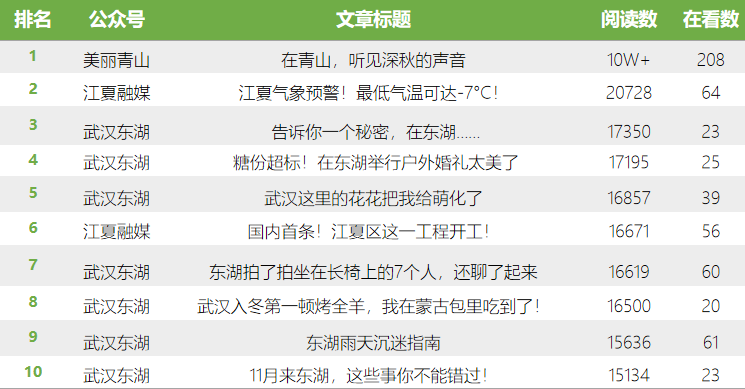 2020年11月,"美麗青山”的《在青山,聽見深秋的聲音》一文,成為本月唯一一篇閱讀量破10萬+的文章,在看數和點贊量均超過200次。文章以美圖加美文的形式展現青山的美麗秋景,令人心向往之,電影大片質感的攝影為文章添色增彩,成為吸引讀者的亮點所在。在本期的微信文章閱讀量前十排行榜中,“武漢東湖”占了7席,可謂是一枝獨秀,同樣是圖文并茂的形式,話題多為美景、美食、生活類,貼近群眾生活。剩余兩席被“江夏融媒”包攬,均為服務類信息,包括氣象提示和工程信息,以實用性受到眾多讀者關注。
