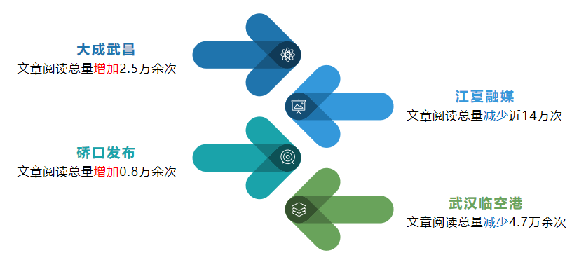 本期,“大成武昌”“大江金岸”“硚口發布”閱讀總量較上期有所上升,其中,“大成武昌”閱讀總量本期共68928次,較上期43394次增加了25534次,取得不錯成績。除此三家外,其余公眾號文章閱讀總量均有不同程度下滑,“江夏融媒”閱讀總量下跌近14萬次,跌幅最大,“武漢臨空港”次之,下跌4.7萬余次。