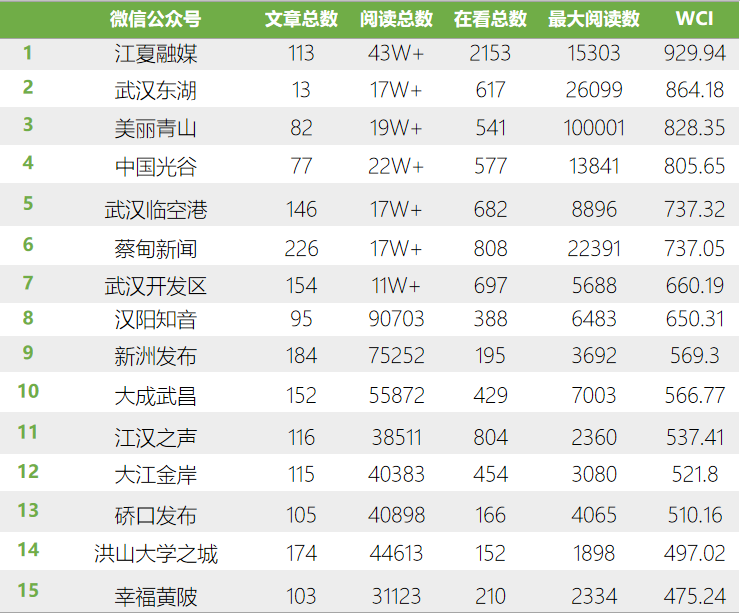 2021年1月12日,由荊楚網(湖北日報網)、楚天輿情數據研究院制作的武漢城區政務微信2020年12月排行榜發布。本期榜單前三甲與上期相同,名次也未發生變化。“江夏融媒”以929.94的WCI值繼續領跑,且其文章閱讀總量也以絕對優勢遙居榜首;“武漢東湖”“美麗青山”各項數據變化不大,表現穩定。