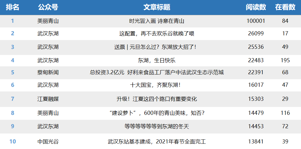 與上期榜單不同,12月文章閱讀量排名前十榜單呈現多家開花的態勢,除了排名前三甲的公眾號“江夏融媒”“武漢東湖”“美麗青山”,“蔡甸新聞”“中國光谷”均有文章擠進榜單。其中,“蔡甸新聞”《總投資3.2億元 好利來食品工廠落戶中法武漢生態示范城》一文的閱讀量、在看量均表現不俗,拿到排名第五的成績。文章內容為招商引資,蔡甸區人民政府與北京好利來投資管理公司達成合作,將有力拉動蔡甸區經濟動能,為人民群眾所喜聞樂見;“中國光谷”《武漢東站基本建成,2021年春節全面完工》一文內容為基礎設施建設,涉及百姓關注的武漢東站,因而受到較多關注。“美麗青山”有2篇文章上榜,且均表現優異,《時光皆入畫 詩意在青山》一文列居榜首,是唯一一篇閱讀量破10萬+的文章,而文章《“建設蘿卜”,600年的青山美味,知否?》是榜單中點贊量最高的文章,表現可圈可點。“武漢東湖”仍舊是上榜文章最多的公眾號,本期上榜5篇,其中,《東湖,生日快樂》一文為在看數最高的文章。