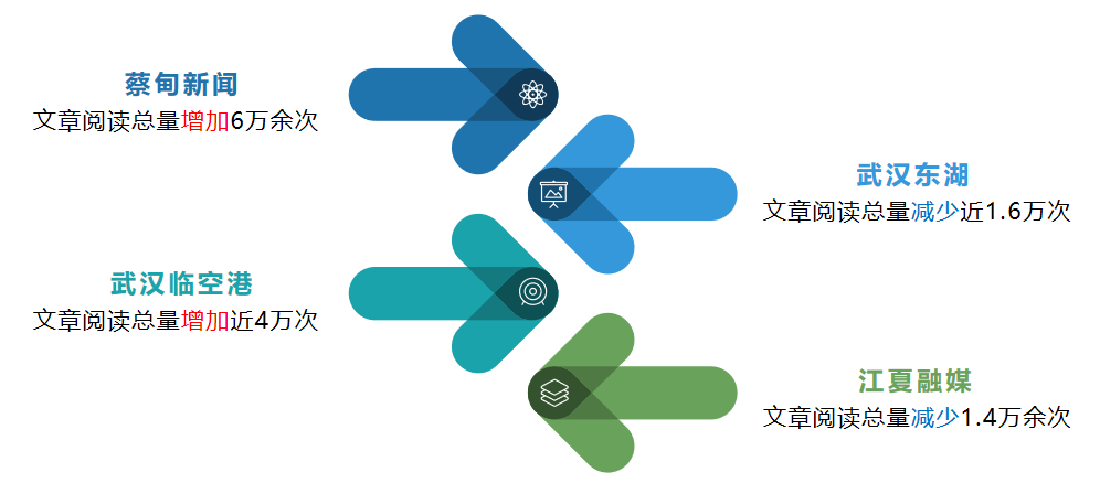 本期榜單中,在文章閱讀總量指標上,除了“江夏融媒”“武漢東湖”“大成武昌”三家有所下滑外,其余各家微信號文章閱讀總量較上期均有不同程度增加。其中,“蔡甸新聞”表現尤為亮眼,閱讀總量較上期增加了60543次,為漲幅最大的公眾號;“武漢臨空港”次之,閱讀總量較上期增加38768次;“漢陽知音”第三,增加21664次。
