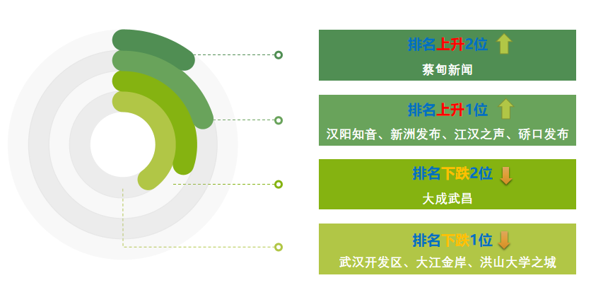 本期榜單前五名與上期相比均未發生變化。排名上升的公眾號包括,“蔡甸新聞”上升2位,“漢陽知音”“新洲發布”“江漢之聲”“硚口發布”均上升1位。排名下降的公眾號包括,“大成武昌”下降2位,“武漢開發區”“大江金岸”“洪山大學之城”均下降1位。“幸福黃陂”排名保持不變。