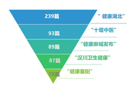 從文章發布總數來看,TOP5公眾號名單與上期保持一致,排位稍有變化。具體來看,“健康湖北”以239篇穩居第一,“十堰中醫”以93篇的發文量排名第二。緊隨其后的是“健康麻城發布”“漢川衛生健康”和“健康襄陽”,發文量分別為89篇、87篇和78篇。