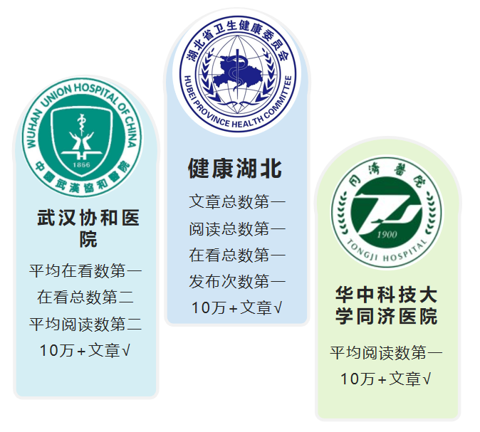 12月榜單前三甲具體排名小有變化,“健康湖北”“武漢協和醫院”繼續蟬聯榜單前兩名,“華中科技大學同濟醫院”以994.9的WCI值取代“湖北疾控”躍升第三名。前三甲公眾號中均有10W+爆款文章產出。