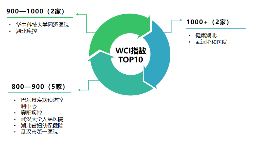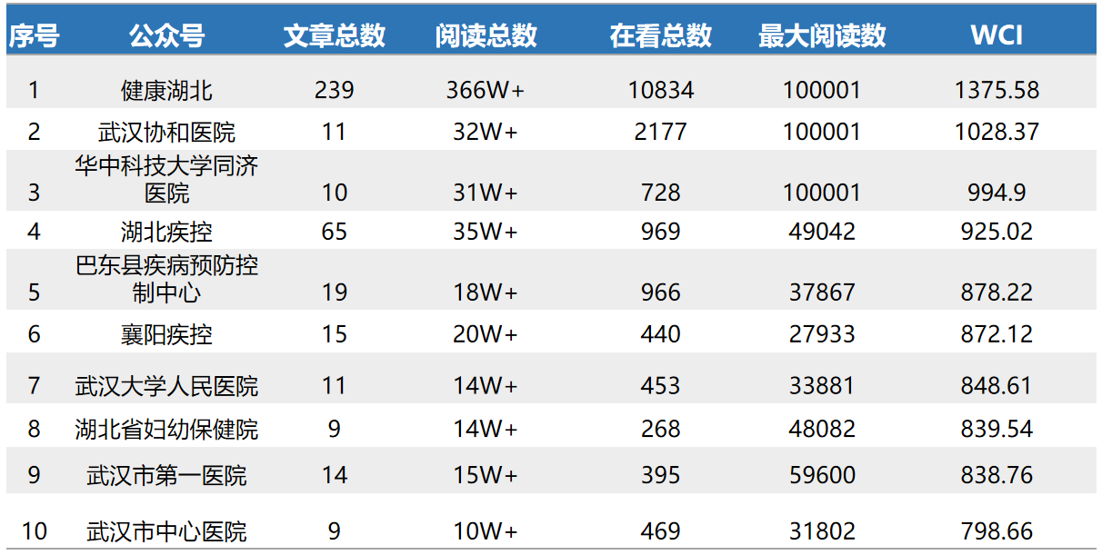 本期TOP10微信公眾號中,“健康湖北”以1375.58的WCI值繼續蟬聯榜首,包攬文章總數、閱讀總數、在看總數、發布次數等多項指標的第一名。從WCI指數來看,處于3個區間的公眾號數量與上期保持一致,“健康湖北”和“武漢協和醫院”2家保持在1000+以上;WCI值為900—1000的單位有2家,700—900的單位有6家,多家單位平均閱讀數低于10000,在看總數不超過1000,對WCI指數產生較大影響。