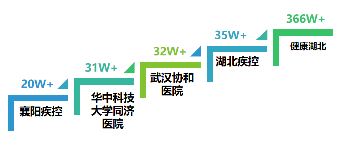 從文章閱讀總數來看,“健康湖北”一騎絕塵,與排第二、三名的“湖北疾控”和“武漢協和醫院”相差超330W,可見醫療行業各公眾號之間斷層現象明顯。“華中科技大學協和醫院”雖然推文數量不多,但以31372的平均閱讀數占據該指標的第一位,由此可見,其單篇文章質量較高,值得其他公眾號學習。