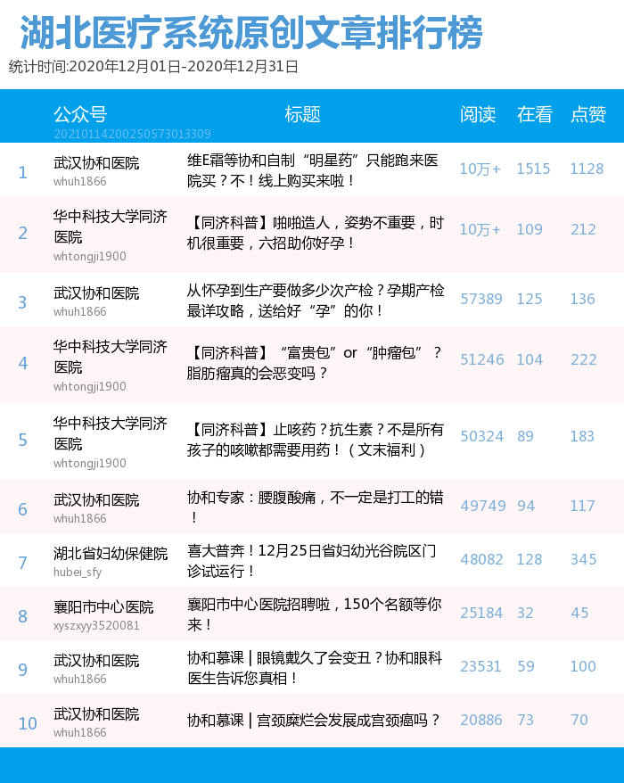 12月,原創文章榜單TOP10推文內容主要涵蓋醫療科普、知識辟謠、醫院資訊、招聘信息等方面,其中“武漢協和醫院”攜5篇原創文章占據前十榜單半壁江山;“華中科技大學同濟醫院”原創文章3篇緊隨其后,“湖北省婦幼保健院”和“襄陽市中心醫院”分別有1篇文章入圍。
