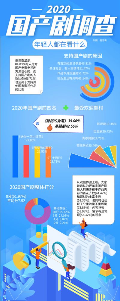 《安家》《三十而已》《大江大河2》《隱秘的角落》……過去一年中,口碑“爆表”的國產影視劇不在少數,也有一些被抱以期待的作品“高開低走”。近日,中青校媒面向全國814名Z世代大學生發起問卷調查,了解他們觀看國產影視劇的體驗和對國產影視劇的態度。調查結果顯示,23.71%受訪者非常喜歡國產影視劇,60.32%比較喜歡,還有13.27%不太喜歡,2.70%完全不喜歡。在不同國家的影視劇中,最受受訪Z世代歡迎的是國產劇(66.71%),其次是美劇(38.82%)和韓劇(37.96%),滿分10分的情況下,Z世代給過去一年的國產劇打7.52分。