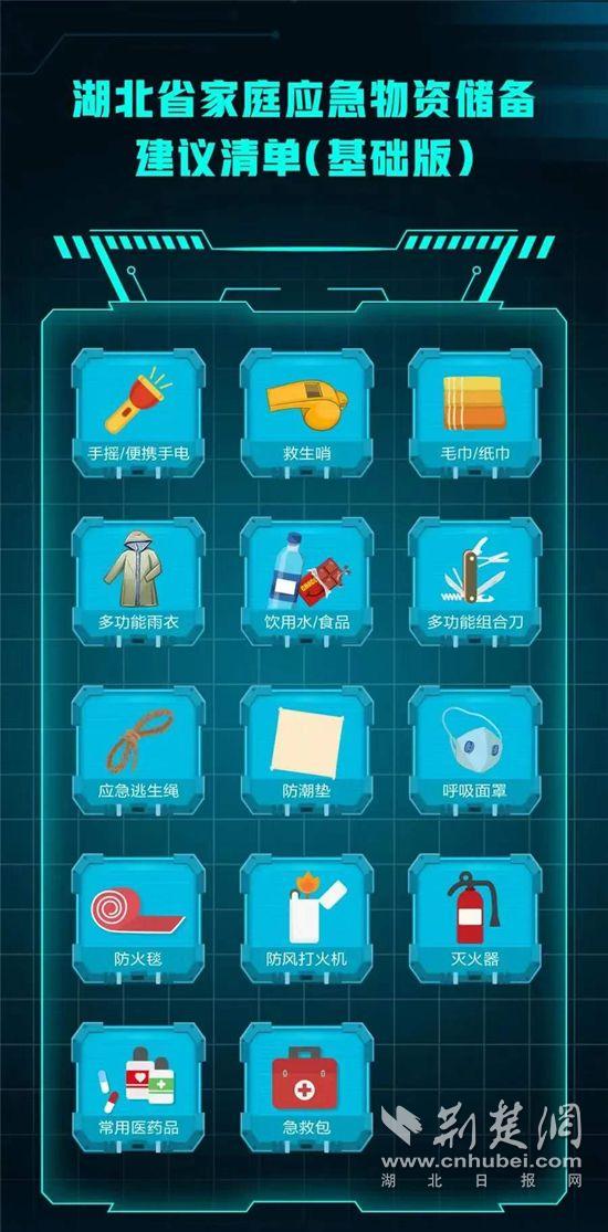 建議清單分基礎版和擴充版。基礎版為常見災害和適用全災種所需物品,分應急物品、應急工具、應急藥具三大類,共14項最基本的應急物資。“針對湖北洪澇災害多、濕度高的情況,湖北版清單建議家庭儲備防潮墊,用于人員和物品防潮。”湖北省應急管理廳相關工作人員介紹。