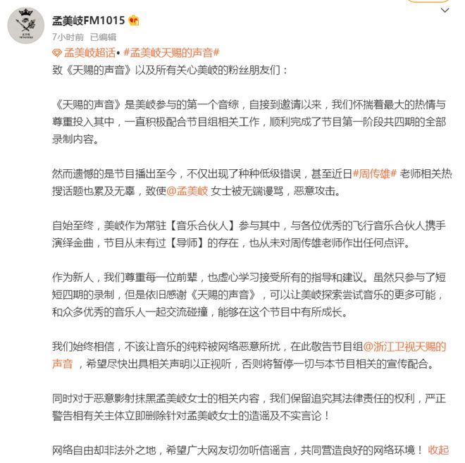2月2日凌晨,孟美岐方發(fā)文回應(yīng),表示作為常駐“音樂合伙人”參與節(jié)目,從未有過導(dǎo)師,也從未對(duì)周傳雄老師作出任何點(diǎn)評(píng),敬告節(jié)目組盡快出具相關(guān)聲明,否則將暫停一切與本節(jié)目相關(guān)的宣傳配合。