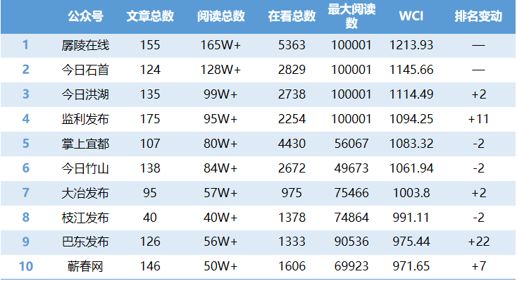 隨著春節臨近,國內疫情出現多點散發現象,“春節能否回家過年”“異地回鄉是否需要核酸檢測”“中高風險地區回鄉是否需要集中隔離”成為公眾關注的熱門話題,各公眾號密集推文、及時回應公眾關切、扎實發揮政務服務功能,獲得了良好的傳播效果。其中,“巴東發布”和“監利發布”進步最為明顯,兩賬號排名分別提升22位、11位,成為前十榜單新晉單位。值得關注的是,“監利發布”憑借175篇的最高發文量和2篇閱讀量10萬+熱文,將WCI值拉升260.93,成為漲幅最大的單位。