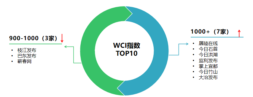 從WCI指數來看,本期TOP10賬號WCI指數總體處于較高水平,均高于900。其中,有7家單位高于1000,較上期增加4家,分別是“今日洪湖”“監利發布”“今日竹山”“大冶發布”;指數在900—1000區間的有3家,具體是“枝江發布”“巴東發布”“蘄春網”。總體來看,區縣系統整體表現亮眼,頭部賬號范圍擴大,發展較為均衡。