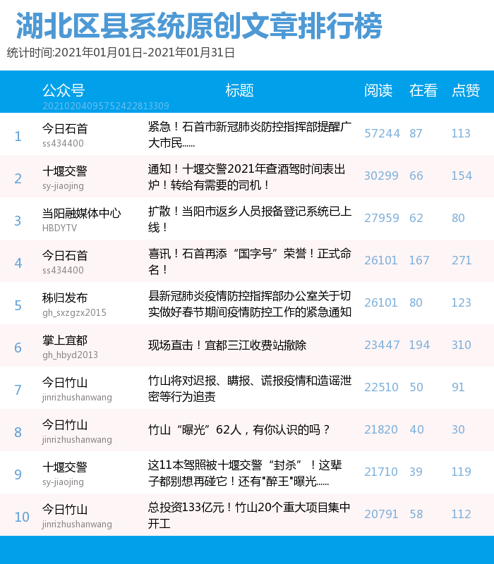 2月7日,由荊楚網(湖北日報網)、楚天輿情數據研究院制作的湖北區縣微信排行榜1月榜單發布,“孱陵在線”“今日石首”蟬聯榜單冠亞軍;“今日洪湖”以WCI值1114.49首次進入前三甲。1月,隨著春節臨近,各地返鄉政策成為民眾關注焦點,各公眾號緊抓熱點話題、及時發布最新返鄉政策,符合民生期待,在網絡上形成熱烈互動,助推系統內各公眾號熱度攀升。