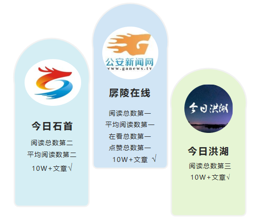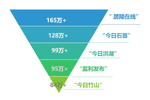 從文章閱讀總數來看,“孱陵在線”以165萬+的閱讀量占領榜首,較上月增加65%,漲勢喜人;排名第二是“今日石首”,閱讀總量為128萬+;“今日洪湖”“監利發布”分別以99萬+和95萬+的閱讀量緊隨其后。