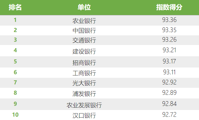 數據顯示,榜單前三名在輿論場中獲主流媒體聚焦效應顯著,均未出現顯著負面輿情,輿論口碑優質。農業銀行排名從上期的第三位升至第一位,交通銀行排名提升顯著,重回前三甲。本期上榜銀行傳播指數較上期均有所提高,93分以上的銀行從上期的4家增至6家。在前十榜單中,除了農業銀行、交通銀行排名上升,招商銀行的排名上升1位,與之相反,建設銀行成績下降明顯,下降3位。此外,本月榜單上榜單位與上期相比出入較大,光大銀行、浦發銀行、漢口銀行重回前十,農村商業銀行、湖北銀行、平安銀行被擠出前十名。