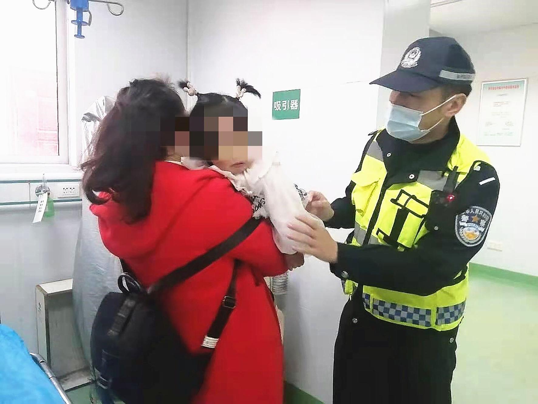18日上午9時45分左右,一輛白色小汽車突然停在新洲區交通大隊新施公路汪集春運服務站執勤民警、輔警面前。一名年輕人神情慌張地向民警求助:“我女兒從樓上摔下來,前方堵車,請你們幫忙送我們到醫院。”