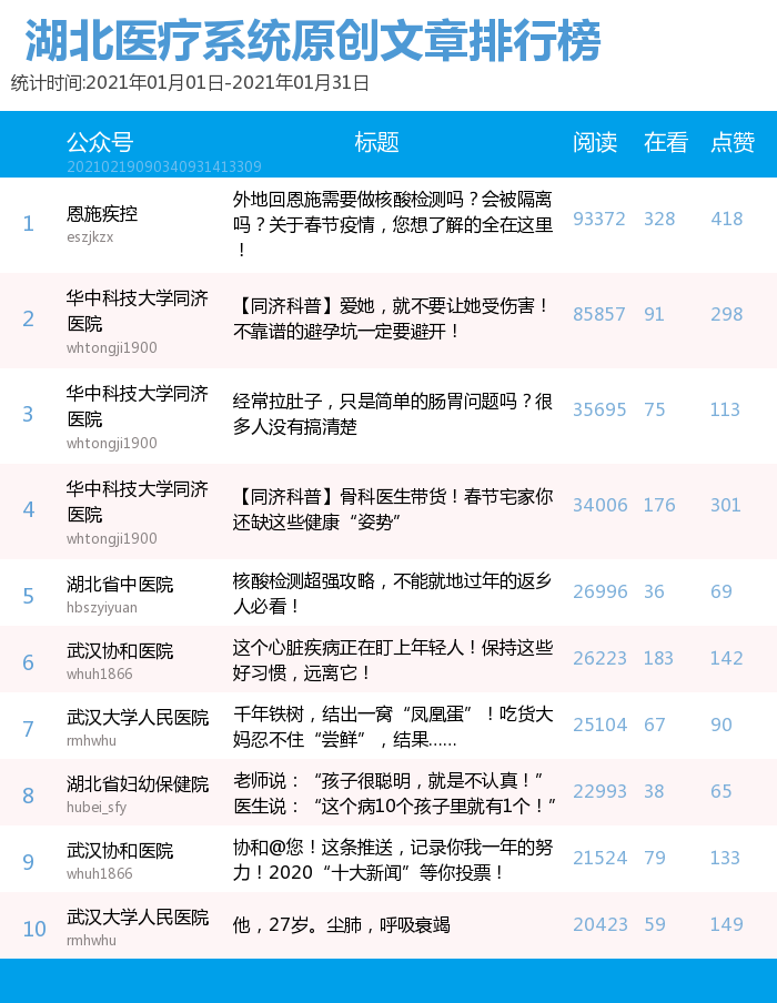從1月原創文章TOP10來看,共有6家微信號入榜,較上期新增兩家,其中“華中科技大學同濟醫院”上榜文章數量最多,有3篇文章入榜;“武漢協和醫院”“武漢大學人民醫院”分別攜2篇原創文章入榜;“恩施疾控”“湖北省中醫院”“湖北省婦幼保健院”均有1篇文章入榜。