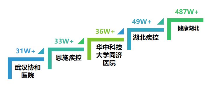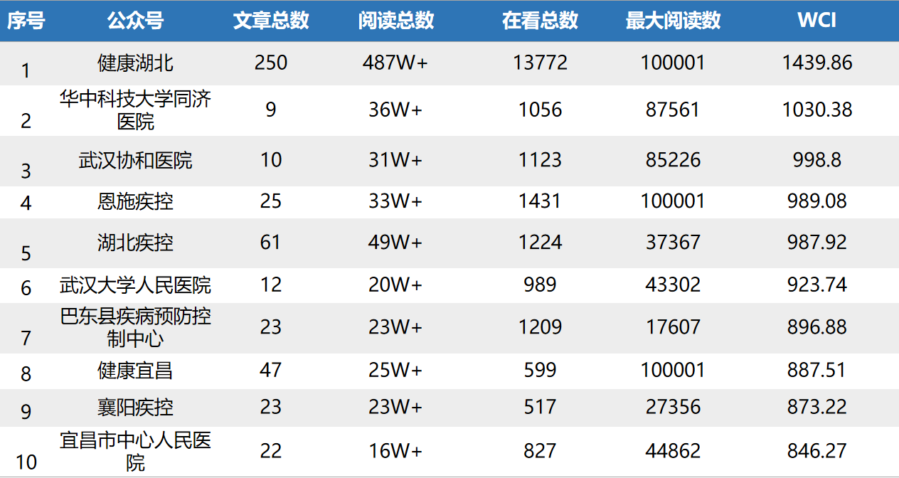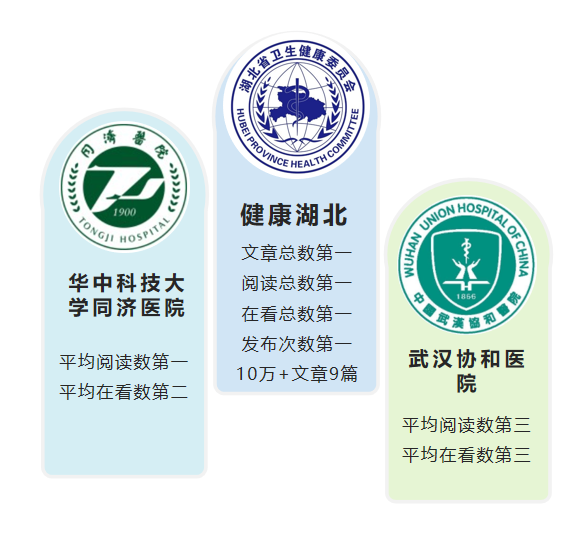 1月,“健康湖北”“華中科技大學同濟醫院”“武漢協和醫院”位列榜單前三甲。其中“健康湖北”以1439.86的WCI值繼續蟬聯榜首,包攬文章總數、閱讀總數、在看總數、發布次數等多項指標的第一名,也是湖北醫療行業榜單中唯一誕生10萬+爆款文章的公眾號。