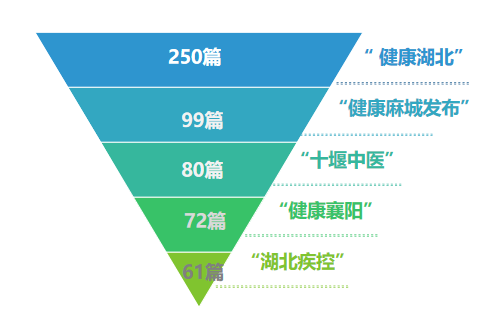 從文章發布總數來看,TOP5公眾號名單小有變化,“湖北疾控”為新晉賬號、“漢川衛生健康”跌出榜單。“健康湖北”以250篇穩居第一;“健康麻城發布”排名第二,發文量99篇,與冠軍差距較大;緊隨其后的是“十堰中醫”“健康襄陽”、“湖北疾控”,發文量分別為80篇、72篇和61篇。