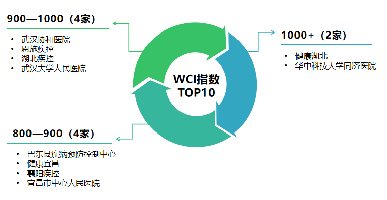 從WCI指數來看,本期TOP10微信公號WCI指數整體呈上升態勢。WCI在1000+以上的賬號有2家,分別是“健康湖北”和“華中科技大學同濟醫院”;900-1000區間的有4家,新增“恩施疾控”“武漢大學人民醫院”兩家,其中“恩施疾控”的WCI增量達277.94,成為本期進步最明顯的賬號;800-900區間有4家,其中“健康宜昌”WCI增量達247.76,成功躍升前十榜單。具體分布如下: